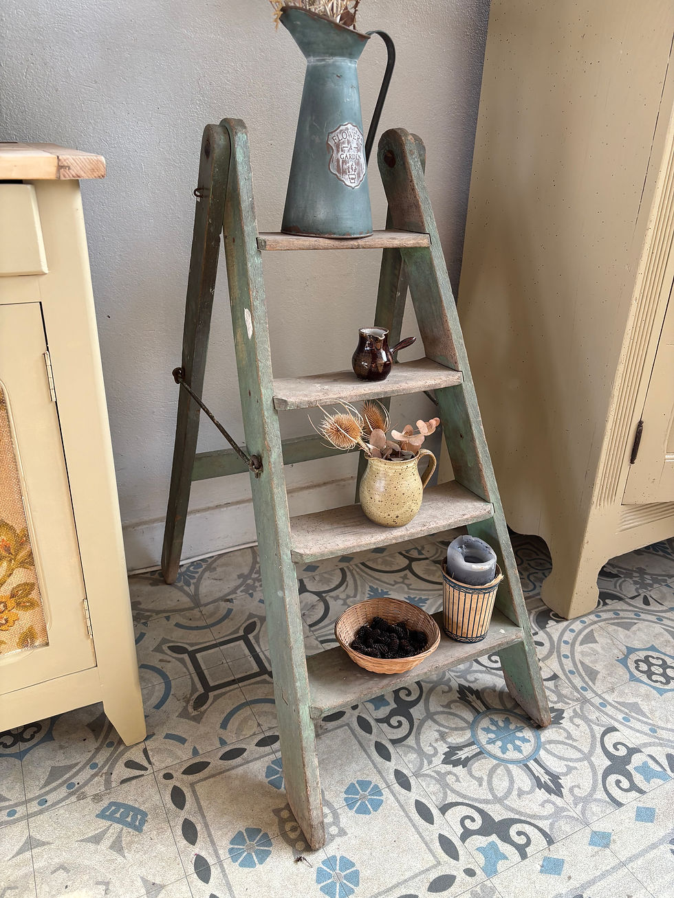 Intérieur étagères et tiroirs peints en bleu clair